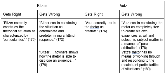 Scott Consigny enters the debate between Bitzer and Vatz as a mediating presence between the extremes of situation-determining-rhetor’s speech and rhetor’s speech-determining situation. He characterizes Bitzer’s position as arguing for an “objective rhetorical situation” that “dominates” and “determines” the rhetorical act, and Vatz’s as “emphasizing the role of the rhetor,” who ultimately creates the situation for their speech. He argues that “Bitzer and Vatz together pose an antinomy for a coherent theory of rhetoric ”and introduces “integrity” and “receptivity” as new concepts which help to bridge this divide. Consigny also argues for a shift away from “situation” and toward “topics” as a broader category for rhetorical analysis.
